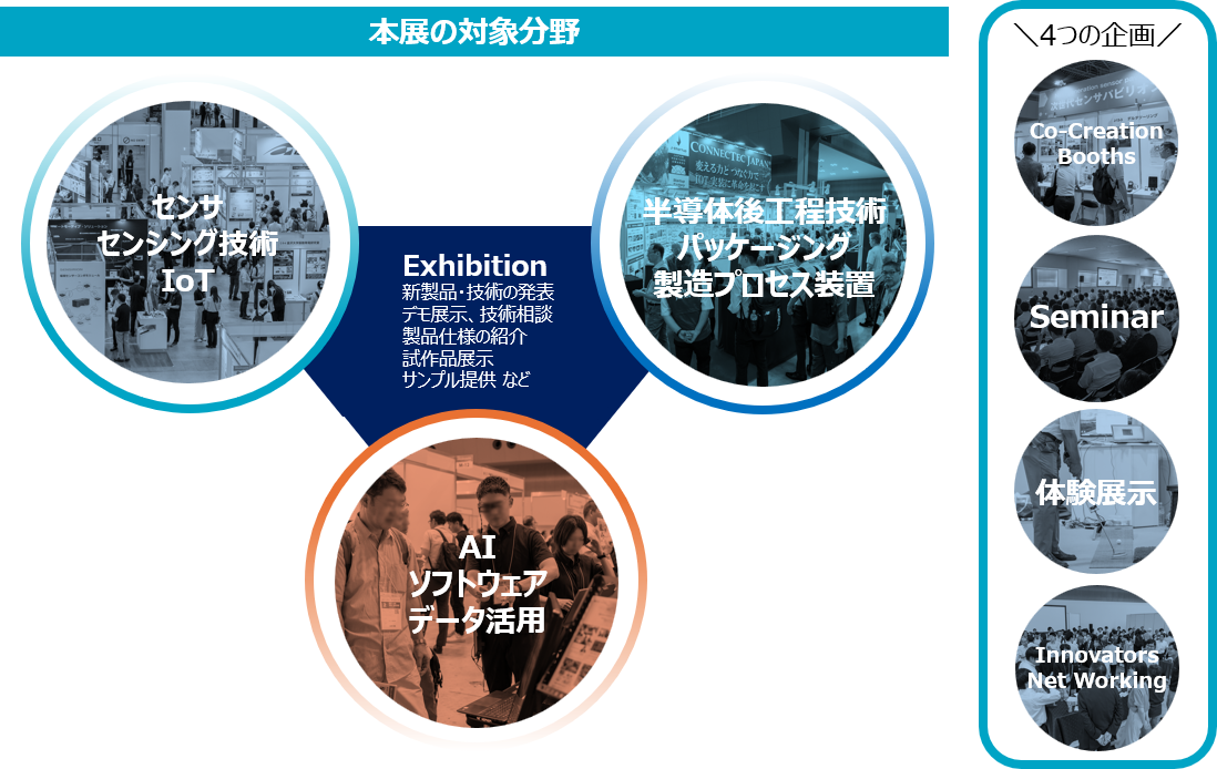 Smart SensingはセンサからAI、データ活用サービスまで、未来の可能性を広げる技術が一堂に会する展示会です。最先端の電子デバイスやセンシング技術を通じて、皆様の製品・技術の発信、製品開発に関するビジネスパートナーの開拓やマーケティングの場としてもご活用いただけます。